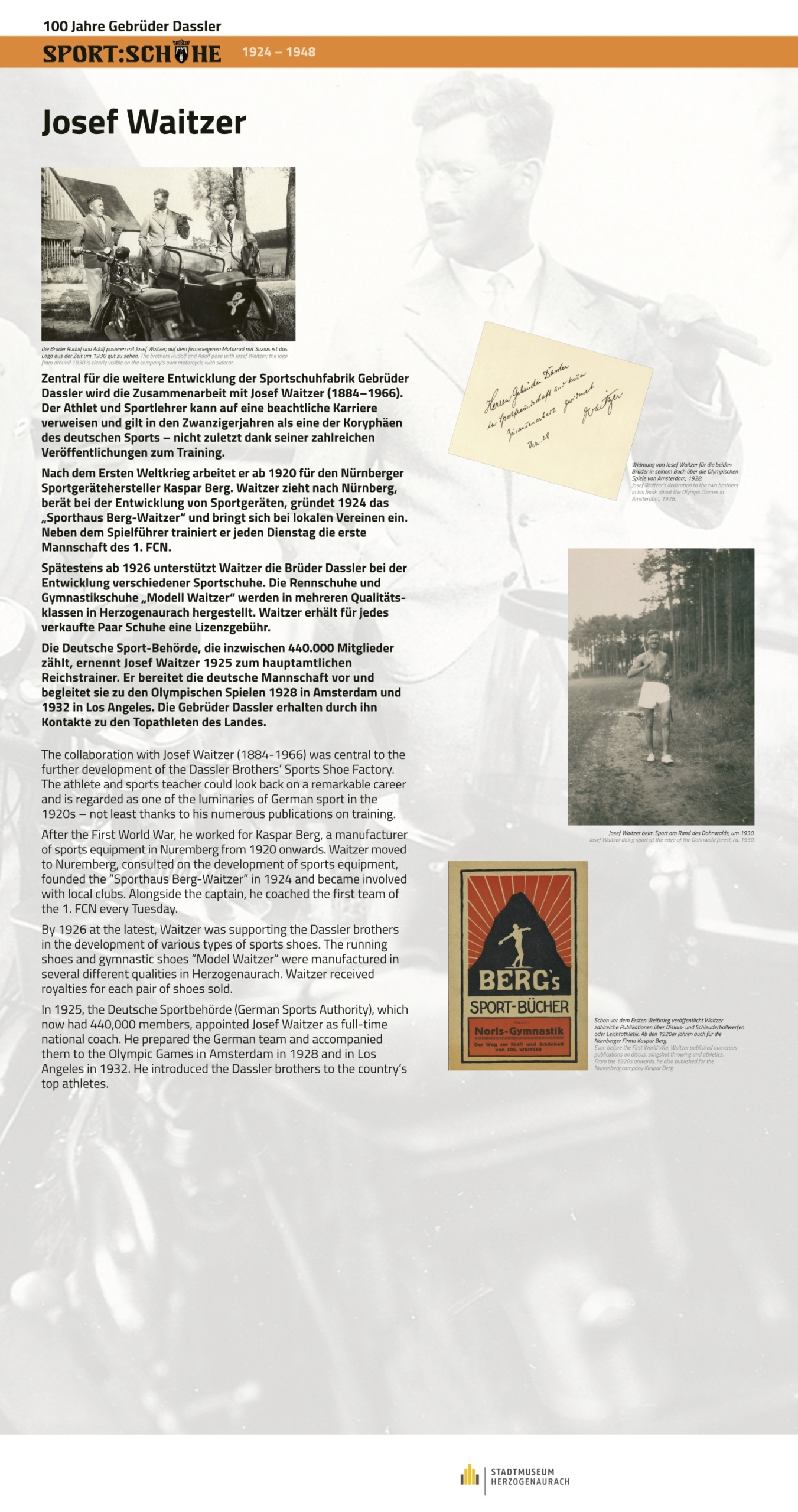 The collaboration with Josef Waitzer (1884-1966) was central to the further development of the Dassler Brothers‘ Sports Shoe Factory. The athlete and sports teacher could look back on a remarkable career and is regarded as one of the luminaries of German sport in the 1920s – not least thanks to his numerous publications on training.